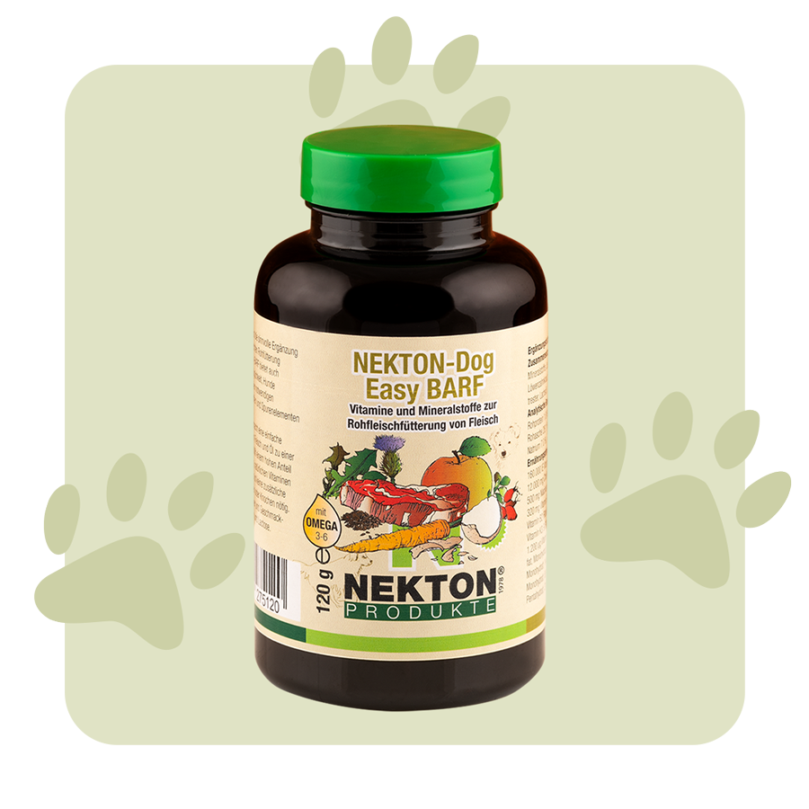 NEKTON-Dog Easy BARF ist die sinnvolle Ergänzung zur biologisch artgerechten Rohfütterung (BARF). NEKTON-Dog Easy BARF bietet auch dem Einsteiger die Möglichkeit, Hunde bedarfsgerecht mit allen notwendigen Vitaminen, Mineralstoffen und Spurenelementen zu versorgen. NEKTON-Dog Easy BARF macht eine einfache Futterration aus rohem Fleisch und Öl zu einer vollwertigen Mahlzeit. Mit einem hohen Anteil an gesunden Kräutern, natürlichen Vitaminen und Mineralstoffen. Es ist keine zusätzliche Fütterung von Innereien oder Knochen nötig.