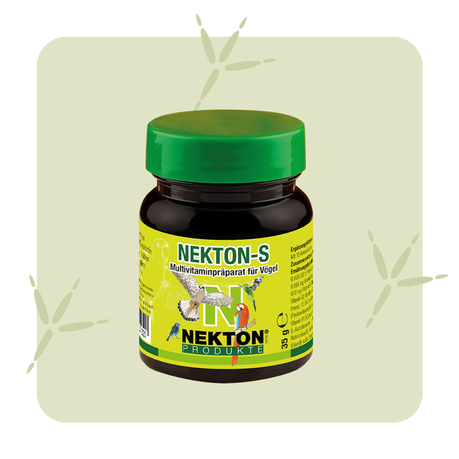 Mit dem Ergänzungsfuttermittel NEKTON-S steht dem Vogelhalter ein Präparat zur Verfügung, das mit seinem hohen Gehalt an Vitaminen, Aminosäuren und Mineralstoffen auf die speziellen Bedürfnisse der Vögel abgestimmt ist und Gesundheitsschäden bei den Tieren verhindert, die durch den Mangel an diesen Wirkstoffen entstehen können. Durch die hochwertigen Inhaltsstoffe werden Aufnahme und Verwertung, der mit dem Futter aufgenommenen Nährstoffe nicht nur ergänzt, sondern auch verbessert und somit aufgewertet. Hierdurch werden die Abwehrkräfte des Vogels gestärkt und die Leistungsfähigkeit verbessert. In Zeiten in denen für den Vogel Stress entsteht, beispielsweise durch Umsetzung, Neuzugänge, Zucht, Mauser etc. kann die Dosis von NEKTON-S der geänderten Situation angepasst und problemlos vorübergehend erhöht, bis verdoppelt, werden.